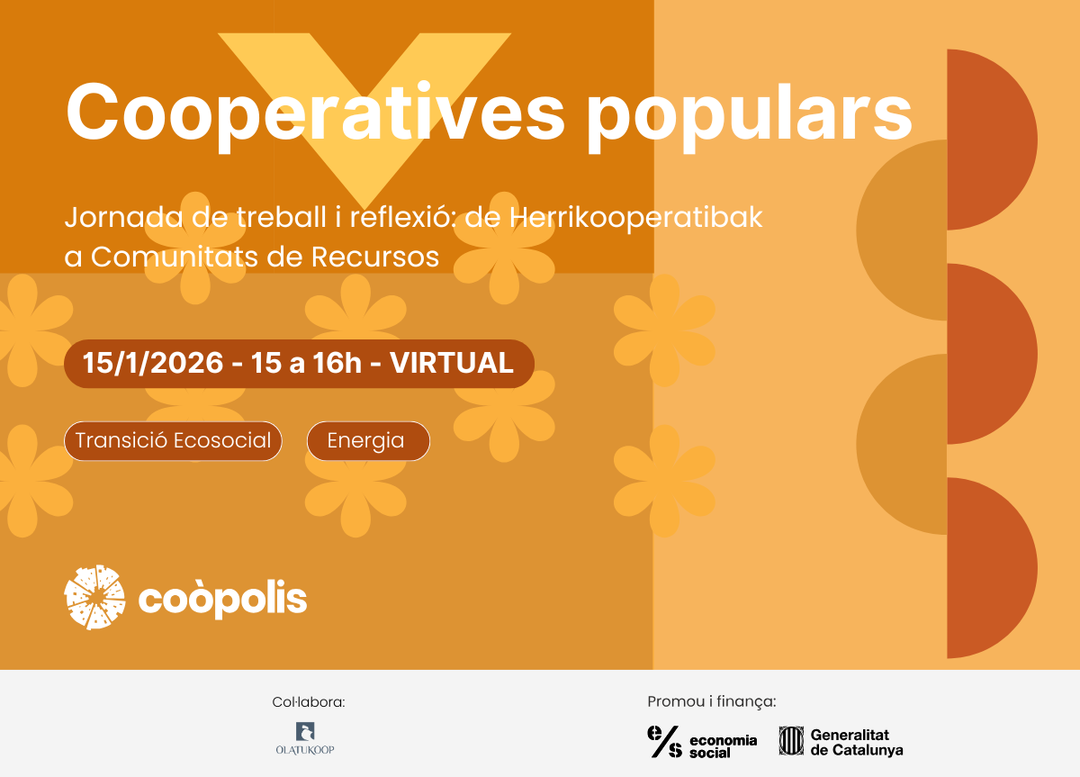 Espai de treball on-line d'intercanvi de bones pràctiques i models de cooperatives populars o de recursos per gestionar de manera col·lectiva (i cooperativa) bens comuns o la cobertura de necessitats bàsiques i comunitàries. Les companyes d'Olatukoop presenten la feina que es resumeix en aquest estudi, i des d'Energia Coopolis compartirem les conclusions del projecte Comunitats de Recursos. Si ets una comunitat energètica o participes de projectes comunitaris de béns comuns, suma't i digues la teva!